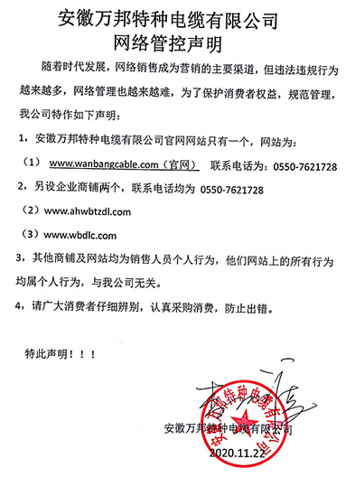 鄭重聲明:安徽萬邦特種電纜有限公司官方網站為:www_jiedaxcl_cn.qzjyw.com,除此之外無任何子網站或合作網站,其余均為假冒偽劣。電話:0550-7621728 13485756353 地 址:安徽省天長市滁州高新技術產業開發區經四路29號